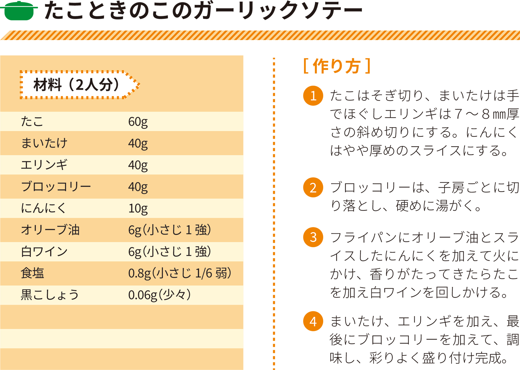 たこときのこはガーリックで香ばしく炒めて、白ワインで香りづけをし、最後に歯ごたえと彩りを加えるために、硬めに茹でたブロッコリーを入れるのがポイントです。MASHの食事療法ではエネルギー制限による体重減少を推奨しますが、単に食事のエネルギーを抑えるだけでは、満足感が得られず、リバウンドに繋がります。そこで、食事のボリューム感は維持しつつ、かつ、噛み応えがあることで、食べ過ぎを防ぐことができます。