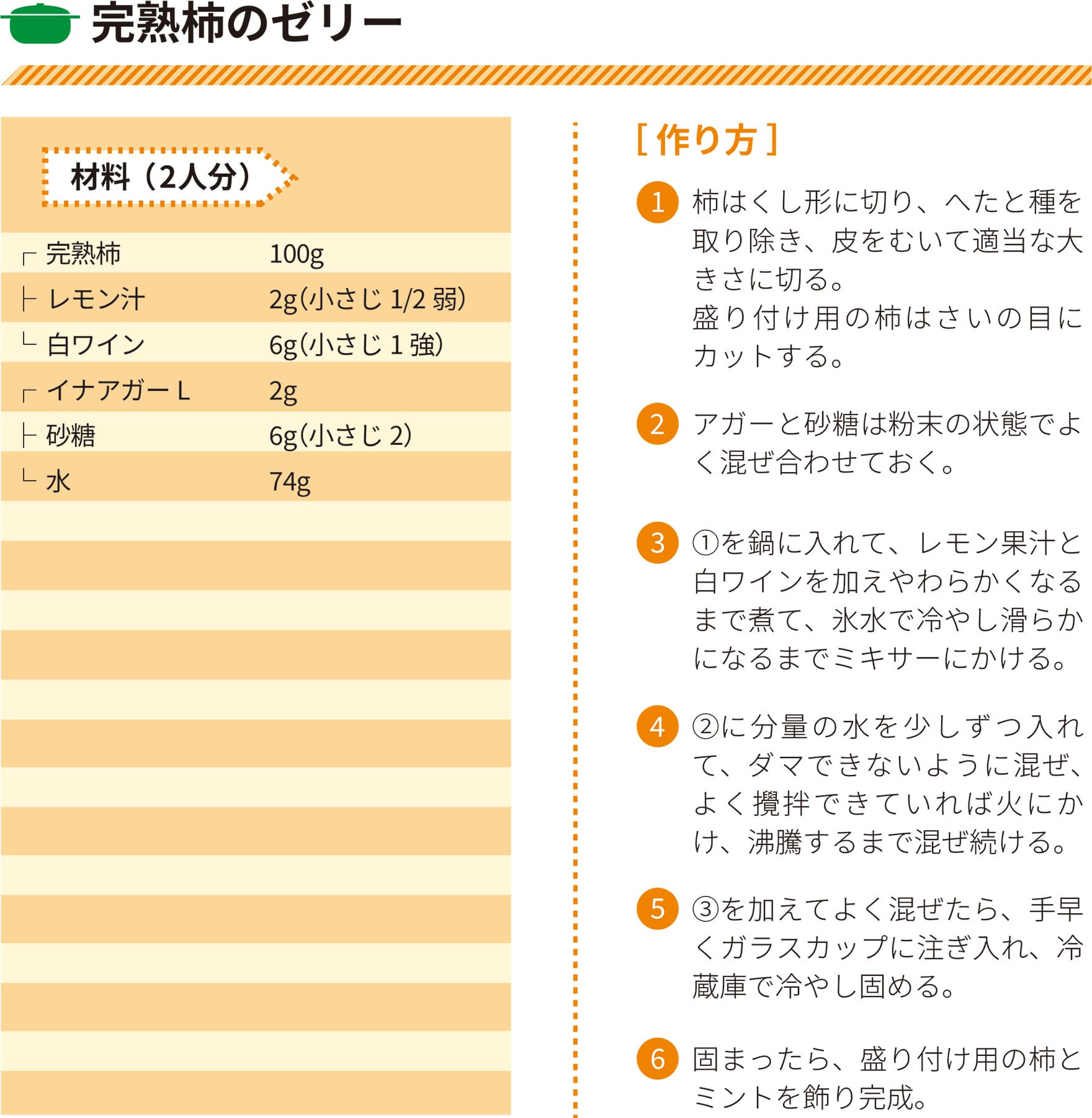 柿は11月に旬を迎え、熟すにつれて、実は柔らかく、甘みが強くなります。そのため、完熟柿は硬めの柿がお好きな方からは、敬遠されがちです。今回はその完熟柿をゼリーにアレンジをしました。できるだけ、自然な甘みを活かすために、砂糖は控えめにし、レモン汁を加えることにより、柿のえぐみを和らげ、さっぱりと仕上がります。ゼリーを固めるにはゼラチンを用いるのが一般的ですが、今回は『アガー』を用いました。アガーは常温でも固まる性質を持ち、透明感のある仕上がりが特徴です。そのため、柿の鮮やかな橙色を引き立てることができます。調理の際は、加熱する前に、アガーを砂糖とよく混ぜておくことで、ゼリーにダマが入るのを防ぎ、舌触りがなめらかな食感に仕上がります。
